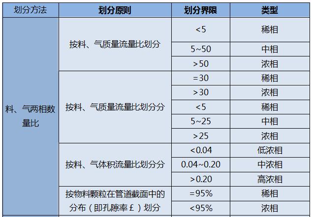 氣力輸送系統(tǒng)有多種不同的分類方法,可按氣力輸送的輸送裝置型式、體現(xiàn)氣力輸送的實(shí)質(zhì)來(lái)分類,也可按狀態(tài)相圖來(lái)分類。對(duì)于不同類型的氣力輸送系統(tǒng),其流動(dòng)差異很大,相互間的流動(dòng)規(guī)律也不能通用。